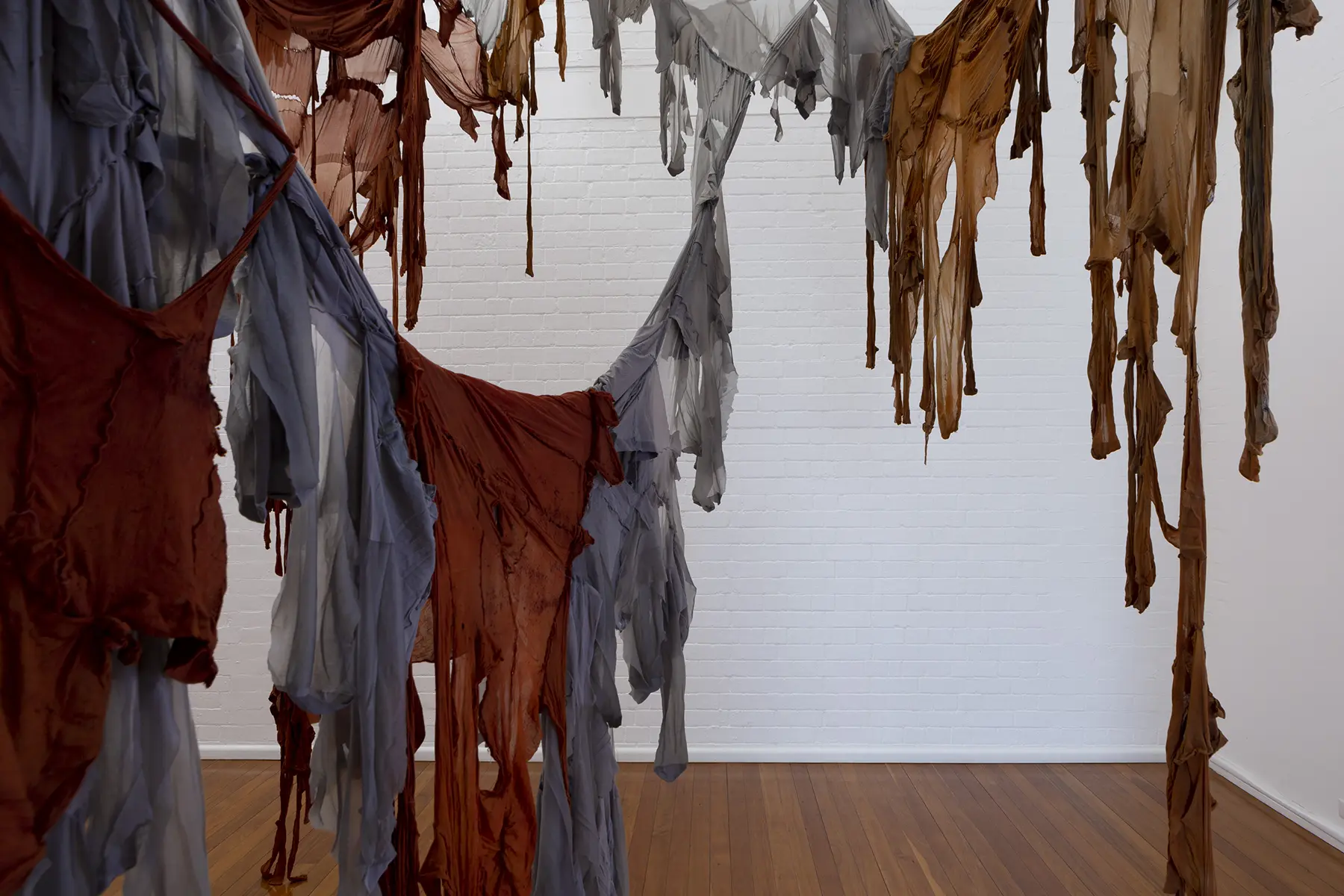 The silvery slink and stained fleshly lure of a webbed membrane of flimsy, torn yet unbreakable stockings is intended as a performative work by the artist: “I will visit it at various stages within the time frame of the exhibition which also reflects the menstruation period of 28 days, to re-stitch and repair parts of the stocking work – sometime alone and sometimes with my mother.”